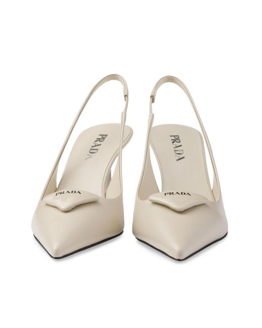 The distinctive crosshatch pattern of Saffiano leather meets a glossy patent leather finish in these slingback pumps with a contemporary design. The pointy slingback style is defined by the geometric heel and the leather triangle logo slightly padded for a three-dimensional effect that completes the feminine shoe with modernist allure. Screen-printed leather triangle logo Saffiano leather Leather sole with metal lettering logo Varnished heels, height: 75 mm / 2.9'' Made in Italy. Lsd Rtw - Prada Rtw > Prada > Saks Fifth Avenue > Barneys. Prada. Color: Beige Khaki. Size: 7.
