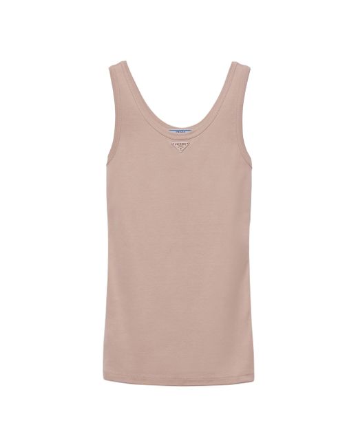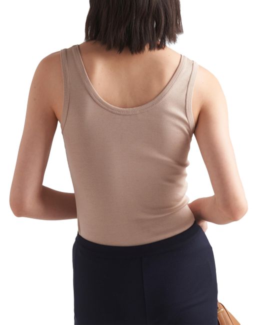 This ribbed knit cotton top is characterized by its skinny fit and embellished with the enameled metal triangle logo. Skinny fit Scoop neck Enameled metal triangle logo Cotton Imported. Lsd Rtw - Prada Rtw > Prada > Saks Fifth Avenue > Barneys. Prada. Color: Beige Khaki. Size: 8.