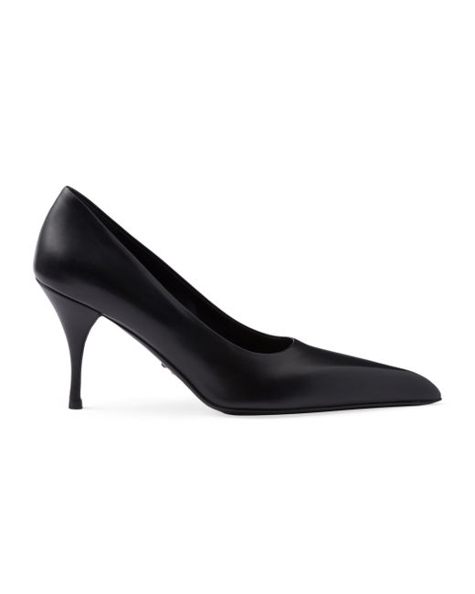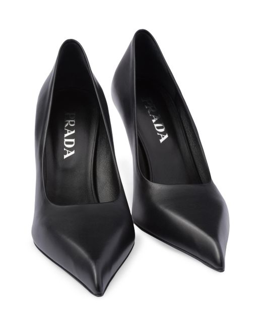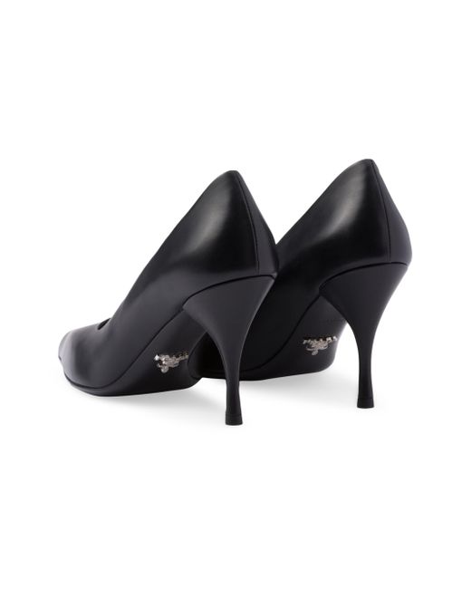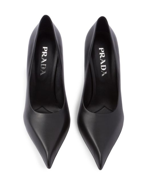 These leather pumps with a sophisticated, feminine design is a contemporary reinterpretation of a timeless silhouette. The style plays with bold, elongated lines that run from the pointy upper to the tapered heel. The refined simplicity of the shapes is enhanced by the lustrous finish of satin that enriches the shoe with a modern and sophisticated touch. Leather and rubber sole with metal lettering logo Leather-covered heel Made in Italy SIZE Height: 3.3''. Lsd Rtw - Prada Rtw > Prada > Saks Fifth Avenue > Barneys. Prada. Color: Black. Size: 7.