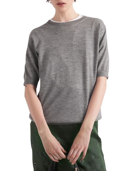 This refined, minimalist crew-neck sweater is made of fine, soft cashmere with a plain knit. The versatile style with a menswear fit has ribbed knit trim, while the sartorial label and knit triangle logo enhance the look with a distinctive yet simple note. Short sleeves Plain knit Menswear fit Ribbed knit collar Semi-raglan shoulder Ribbed knit cuffs and hem Knit triangle logo and sartorial label Cashmere Imported SIZE 62.0H. Lsd Rtw - Prada Rtw > Prada > Saks Fifth Avenue > Barneys. Prada. Color: Grey. Size: 6.