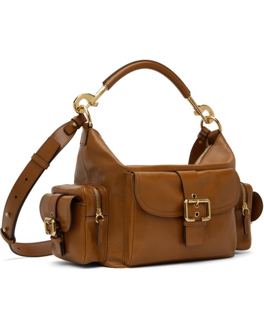 LWG-certified polished buffalo leather shoulder bag in tan. · Detachable rolled carry handle · Detachable and adjustable crossbody strap · Pin-buckle flap pocket at face and sides · Zip pocket at sides · Two-way zip closure · Patch pocket at interior · Cotton- and linen-blend canvas lining · Logo-engraved gold-tone hardware · H9 x W15 x D6 Supplier color: Clay brown