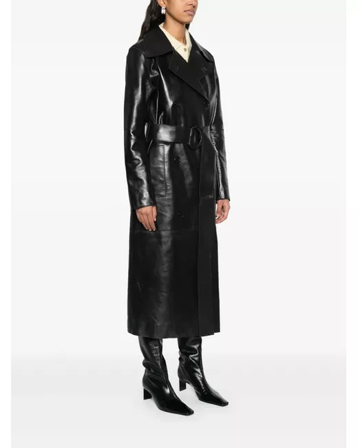 black double-breasted button fastening long sleeves two side welt pockets detachable and adjustable waist belt