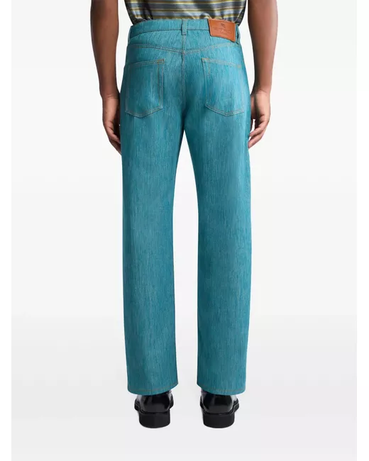 indigo blue cotton washed denim signature Pegaso motif embossed silver-tone buttons concealed fly and button fastening belt loops logo patch to the rear classic five pockets straight leg