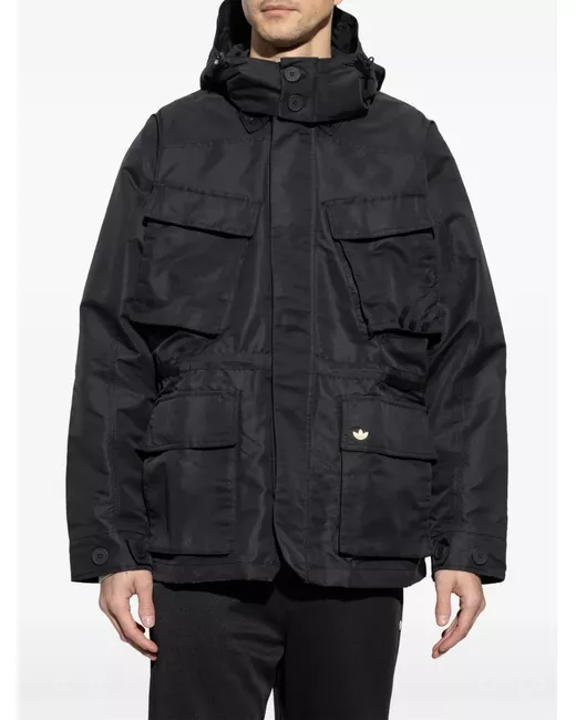 black concealed front button fastening four front patch pockets buttoned-cuff sleeves drawstring waist