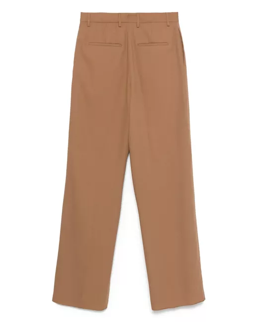 camel brown concealed front button, hook and zip fastening belt loops two side inset pockets two rear welt pockets