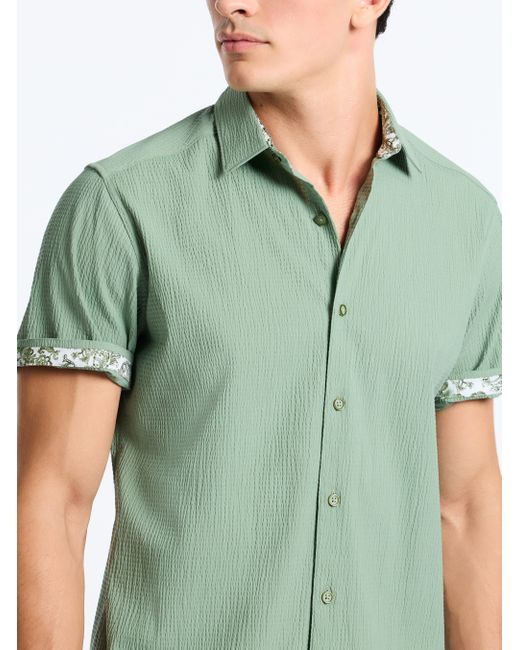 Easy, breezy seersucker is this season's must-have fabric. Wear this quintessentially summer style to your next event and enjoy looking and feeling cool. Choose a Thresher button down in your favorite color or collect them all. Pair back to the matching shorts for head-to-toe style. Point collar Full button front placket Seersucker Contrast detail under collar and sleeve Short sleeve Shirttail hem 99% cotton, 1% spandex Machine wash cold Imported