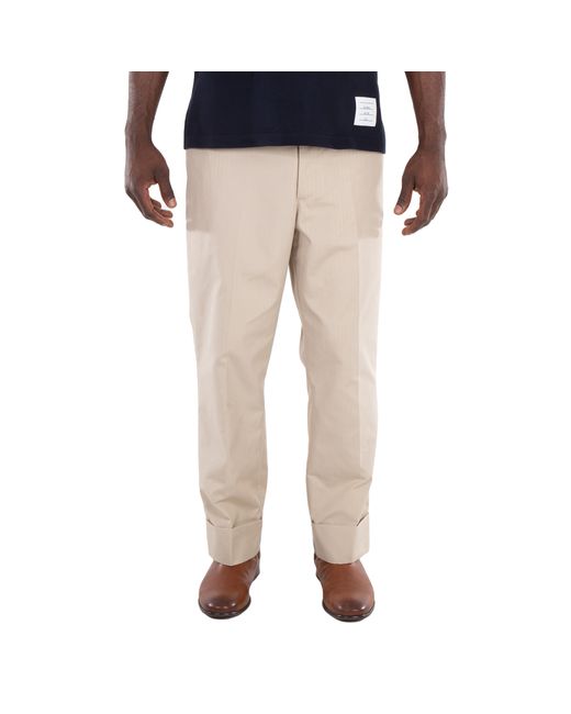 Thom Browne Mens Bottoms. Fashion category: Pants & Leggings. SKU: MTC214A-04502-250. Color: Beige. Thom Browne Mens Beige Typewriter Cloth Classic Backstrap Trouser. This pair of cotton-blend trousers features a tab front closure, slip side pockets, button-fastening back welt pockets, creased legs, wide cuffs, and an adjustable buttoned back strap. Designed with a classic fit, it has a shortened hem for a refined look. 65% Polyester, 35% Cotton.