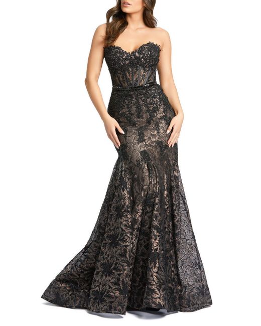 From the Evening Collection. This Mac Duggal lace gown is embroidered with sequins and styled with a strapless, sweetheart neckline. Sweetheart neck Sleeveless Back zip closure 100% polyester Lining: 100% polyester Dry clean Imported SIZE & FIT About 61" from shoulder to hem Model measurements: 5'10" tall Model is wearing a US size 4. Dress Collections - Mac Duggal > Mac Duggal > Saks Fifth Avenue > Barneys. Mac Duggal. Color: Black Beige. Size: 2.