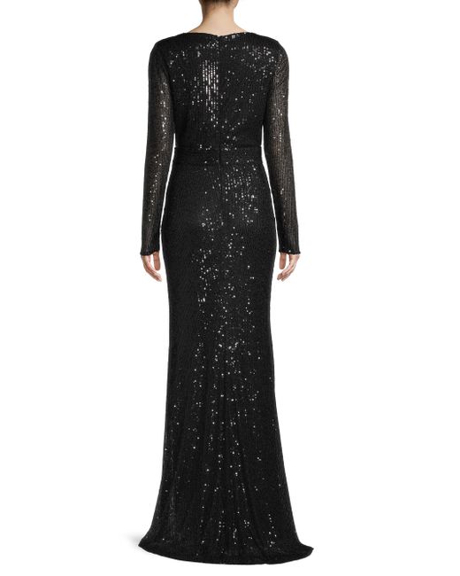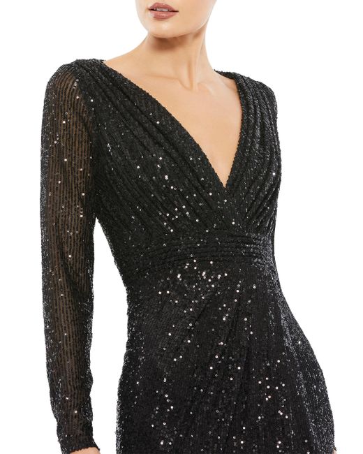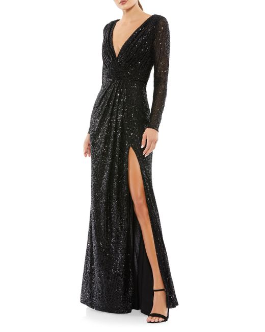Covered in shimmering sequins, this elegant evening gown has a flattering floor-sweeping silhouette. Surplice neckline Long sleeves Concealed back zip Gathered detail waist Thigh-high front slit Pooled hem Polyester Lined Dry clean Imported SIZE & FIT About 62.5" from shoulder to hem Model measurements: 5'10" tall Model is wearing a US size 4 Please note: This Mac Duggal style includes an attached sash located inside the garment. If the sash is removed, this style cannot be returned. ABOUT THE BRAND Mac Duggal's first eveningwear hit, in the mid-1980s, was an A-line dress crafted from tulle with handpainted stars decorated its lining. Since then, the label has become an eveningwear go-to and Hollywood favorite. Nicknamed the "king of bling," the eponymous designer uses sophisticated ornamentation and eye-catching fabrics as a nod to his Indian heritage. Dress Collections - Mac Duggal > Mac Duggal > Saks Fifth Avenue > Barneys. Mac Duggal. Color: Black. Size: 8.