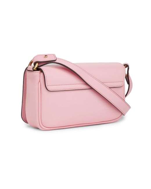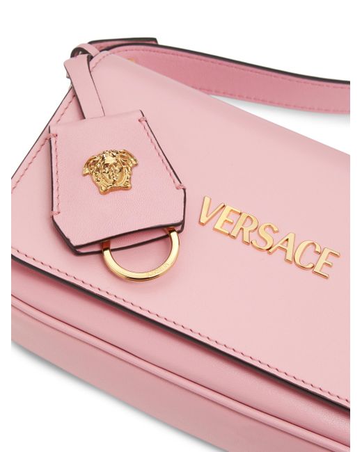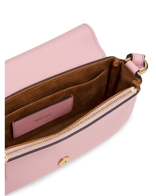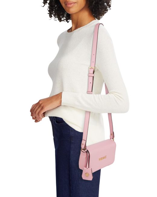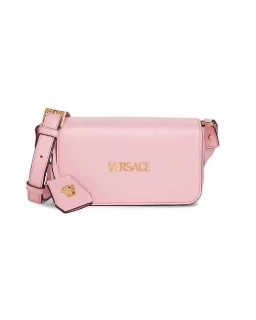 Versace's Tag mini shoulder bag is crafted of leather and styled with the label's logo on the front. Shoulder strap Interior: one slip pocket and one zip pocket Flap with magnetic snap closure Leather Imported SIZE About 7"W x 5"H x 1.4"D ABOUT THE BRAND Founded in 1978, Versace is instantly recognizable by the signature Medusa head logo, chosen by founder Gianni Versace for its Greek symbolism. The Italian label is known for its luxe, bold clothing and accessories-think gilding, oversized logos and punchy prints. Since taking over artistic direction, Gianni's sister Donatella Versace has maintained the brand's strong identity, with a renewed vision to give customers the ultimate freedom to express themselves. Handbags - Italian Designers > Versace > Saks Fifth Avenue > Barneys. Versace. Color: English Rose.