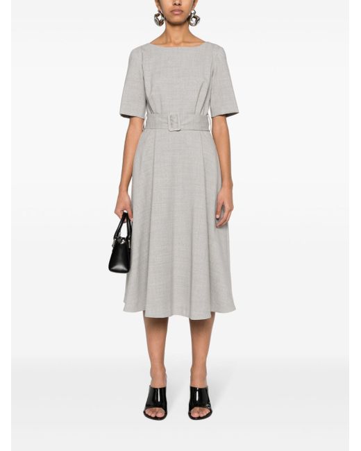Highlightsmidnight bluevirgin wool blendround neckshort sleevesdetachable and adjustable waist belttwo side inset pocketsflared skirtV-backpartial liningstraight hemmid-lengthconcealed rear zip fastening