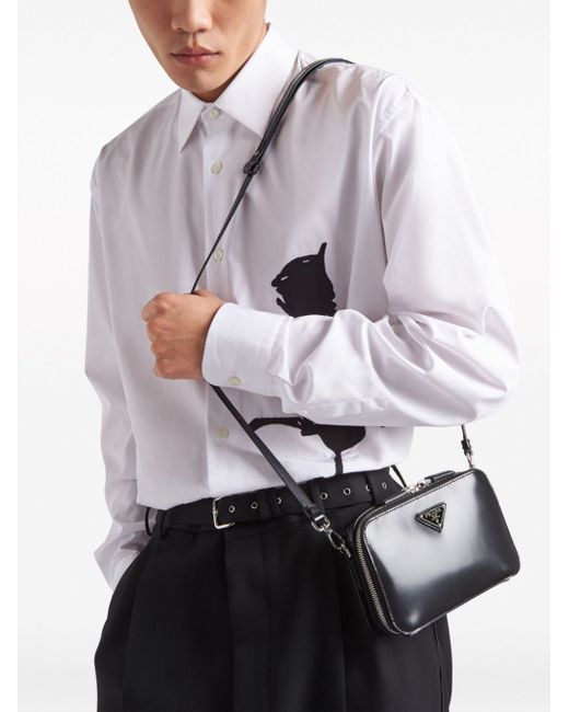 Prada's Brique handbag family takes its name and silhouette inspirations from the namesake masonry material. This small black one is crafted from brushed leather to a structural rectangular shape and fronted with a matching enamelled triangle logo plaque. Highlights