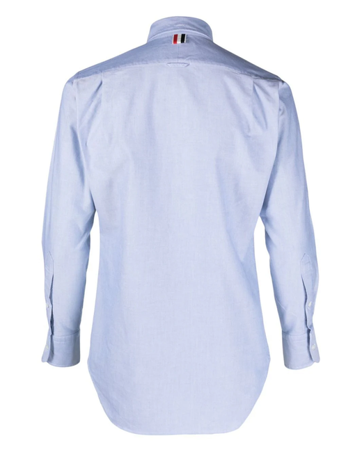 Thom Browne's affinity for sleek silhouettes is captured in the clean lines of this plain light-blue shirt. Crafted from cotton, it is simply detailed with a white logo patch at the hem for a branded touch. Highlights