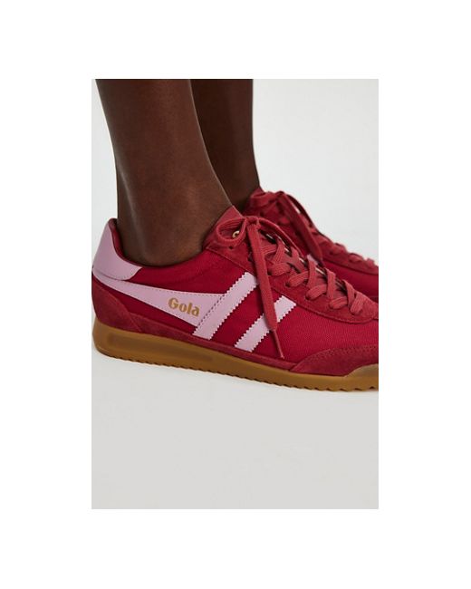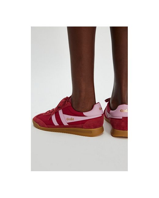 Retro and sporty, this soccer-inspired pair from Gola features heavy-weave nylon uppers and suede and leather overlays, complete with a gum wedge sole for some cool contrast. **Features:** Low-top style, heavy-weave nylon uppers, suede overlays, contrast leather stripes and heel tab, wedge gum rubber sole **Why We Gola Tornado Trainers Shoe at Free People in Deep Red/Candy, Size: US 6