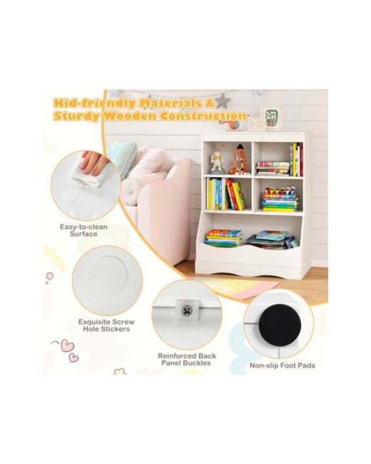 Transform your child's play area with this exceptional kids' toy storage organizer. Offering a combination of functionality and style, this organizer features a spacious tabletop, 4 cubbies, and a large storage bin, providing ample room for toys, books, and decorations.