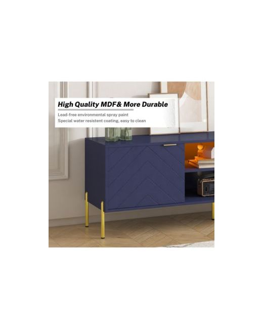This stylish Tv cabinet features a modern wooden door design and a fishbone texture combined with a clean painted frame to create a fresh and three-dimensional modern aesthetic. The lockers are supported by elegant electroplated gold legs with foot pads to prevent damage to the floor. In addition, the Tv cabinet is equipped with two revolving doors, providing plenty of hidden storage space to help you keep your home clean and organized.