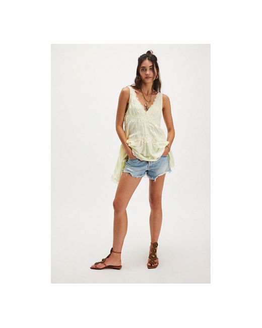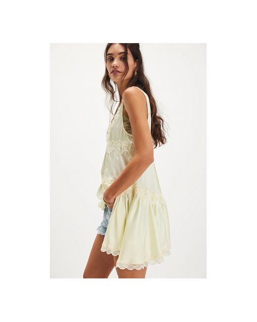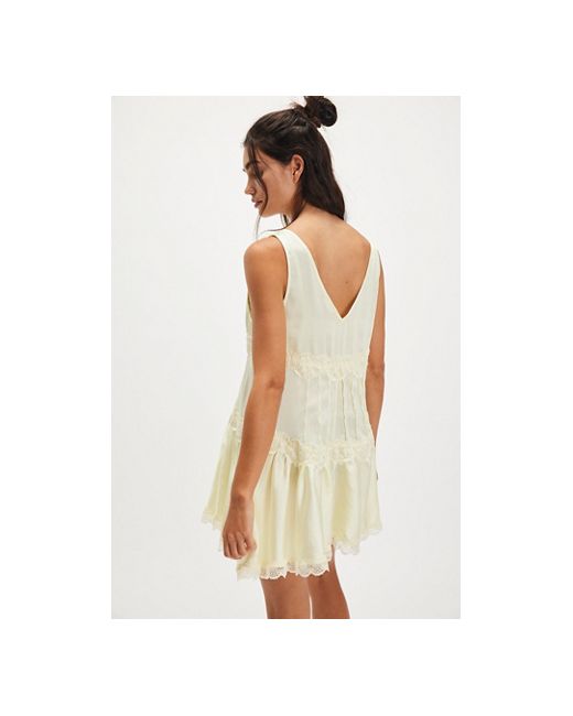Romance awaits with this floaty mini slip from Intimately, featured in a silky, tiered design with lace trim for a truly delicate detail. **Fit:** Mini length, A-line **Features:** Silky fabrication, babydoll style, V-neckline, tiered design, lace trim **Why We In This Groove Mini Slip by Intimately at Free People in Limon Ice, Size: XS