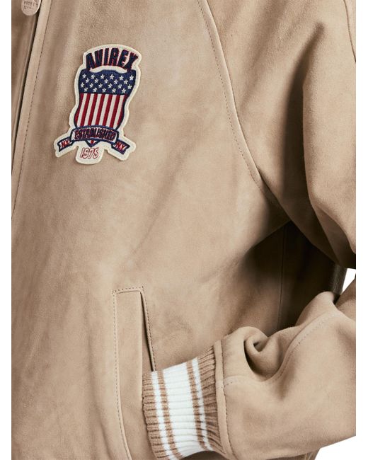 Avirex's Icon bomber jacket is crafted of French suede with striped rib-knit trim. This military-inspired design features Americana logo detailing at the left chest and reverse, along with an authentic "A" crest patch at the back collar. Spread collar Long sleeves Side welt pockets Rib-knit trim Front zip closure 100% suede Dry clean by leather specialist Imported SIZE & FIT Model measurements: 6' tall, 40" chest, 31" waist Model is wearing US size Medium. Mens Modern Coll & Outer - Contemporary Outerwear > Avirex > Saks Fifth Avenue > Barneys. Avirex. Color: Mink. Size: XXL.