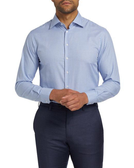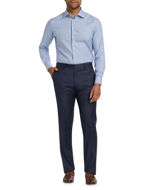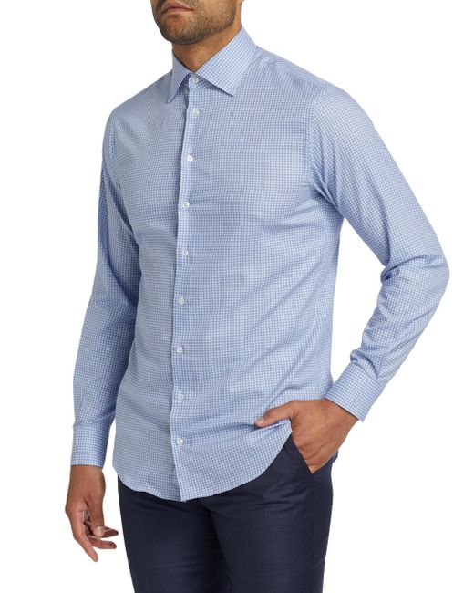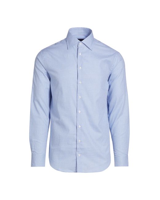 Crafted of crisp cotton, this Giorgio Armani shirt is adorned with a timeless plaid pattern. The style features a spread collar, long sleeves with buttoned barrel cuffs, and a refined front button closure. Spread collar Long sleeves, buttoned barrel cuffs Front button closure 100% cotton Dry clean Made in Italy SIZE & FIT Model measurements: 6'2" tall, 40" chest, 31" waist Model is wearing a US size 40R. Men Luxury Coll - Giorgio Armani C > Giorgio Armani > Saks Fifth Avenue > Barneys. Giorgio Armani. Color: Blue. Size: 16.5.