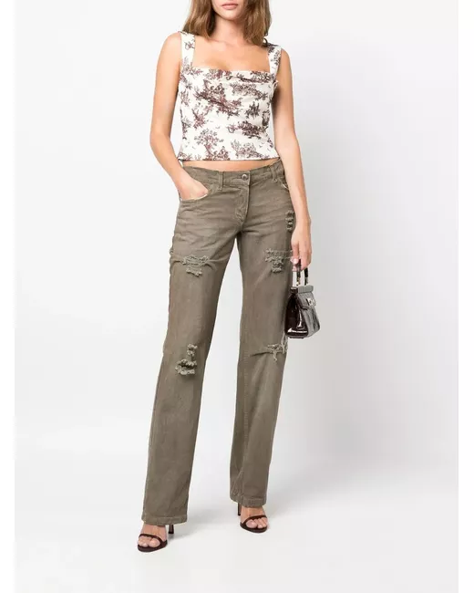 circa 2000s dove grey cotton ripped detailing low-rise front button and zip fastening classic five pockets leather tag belt loops straight leg floor-length Condition: GOOD. This previously owned and used item is in good condition with minimal signs of use. This may include fading of material or plating and scratches.