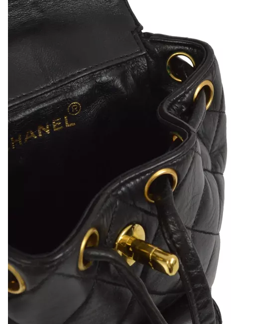 circa 1990-2000 black diamond quilting two leather and chain-link shoulder straps front flap closure signature interlocking CC turn-lock fastening drawstring fastening main compartment internal logo stamp gold-tone hardware Condition: GOOD. This previously owned and used item is in good condition with minimal signs of use. This may include fading of material or plating and scratches.
