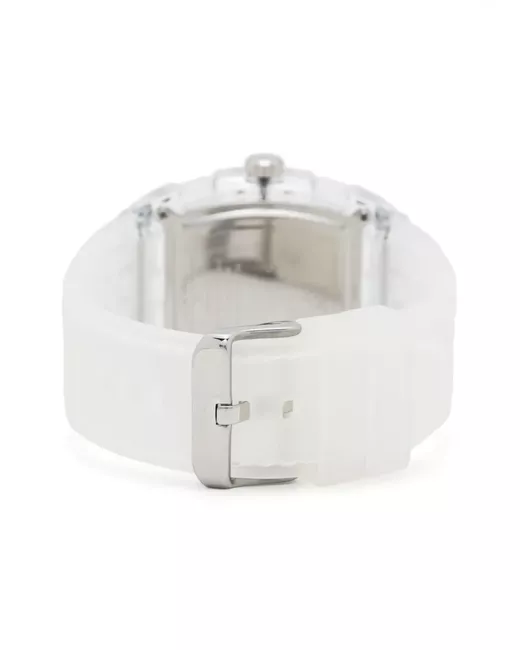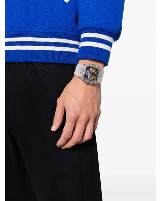 41.5mm silver-tone skeleton dial stainless steel/polycarbonate Arabic dial index hands transparent design screw-down crown silicone strap pin-buckle fastening water resistance up to 50m/5 ATM GUTM2 movement