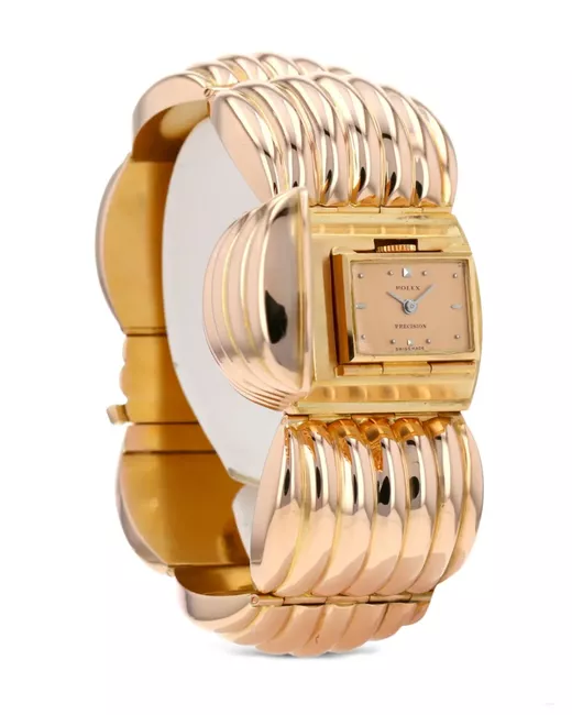 circa 1950s pre-owned 31mm salmon pink rose gold rectangular face hinged lid index dial stick hands mechanical movement centre-dent crown articulated conch-shaped rose gold bracelet folding clasp This item comes with a standard one-year warranty from the boutique. Condition: GOOD. This previously owned and used item is in good condition with minimal signs of use. This may include fading of material or plating and scratches.