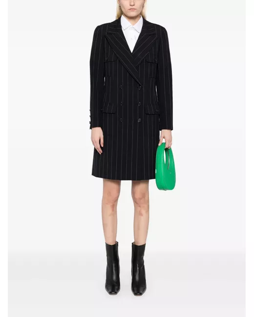 circa 1997 navy blue wool vertical stripe pattern wide notch lapels double-breasted button fastening long sleeves buttoned cuffs four front button-fastening flap pockets full silk lining Condition: GOOD. This previously owned and used item is in good condition with minimal signs of use. This may include fading of material or plating and scratches.