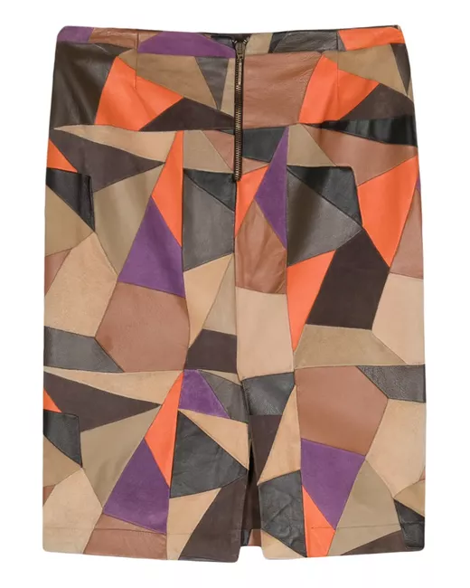 circa 2000s brown/multicolour leather suede panelling geometric-pattern print mid-rise rear zip fastening straight hem above-knee length full lining Condition: GOOD. This previously owned and used item is in good condition with minimal signs of use. This may include fading of material or plating and scratches.
