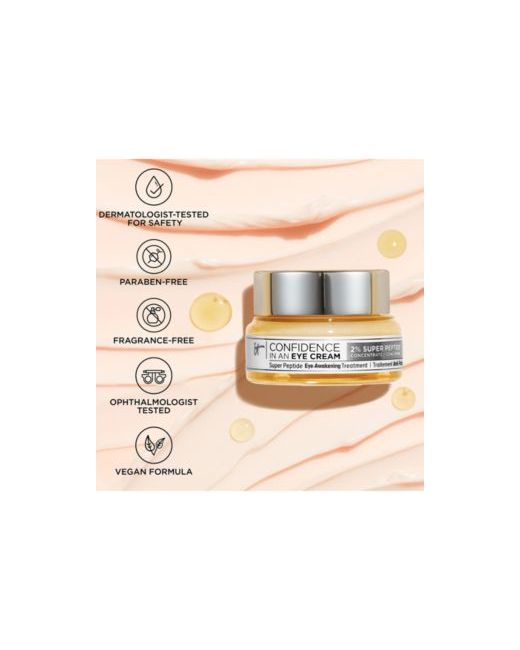 Wake up your eyes, wake up your confidence! The delicate skin around your eyes needs specialized care to fight the signs of aging. Confidence In An Eye Cream is the lightweight anti-aging eye cream you know and love, now reformulated with 2% Super Peptide Concentrate to better address the signs of eye fatigue. The lightweight cream delivers an immediate brightening effect and 48-hour hydration. In just 4 weeks, you'll see a visible improvement in crow's feet, dark eye circles, dryness and lack of firmness. Developed with plastic surgeons' insights and dermatologists' ingredient and skincare expertise, It Cosmetics creates problem-solving, skin-loving formulas that give you visible results.