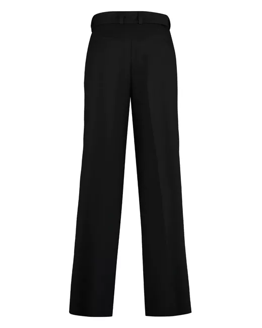black wool pressed crease concealed front fastening belted waist pleat detailing two side slit pockets two rear welt pockets straight leg