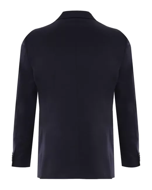 navy blue front button fastening jetted chest pocket two front flap pockets English rear vents