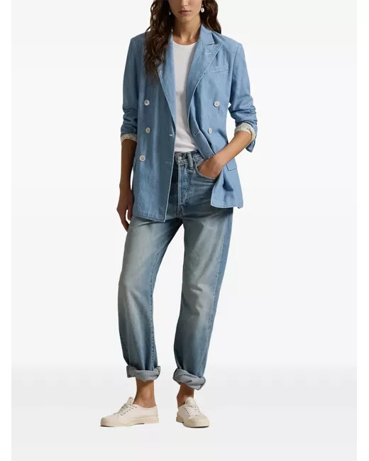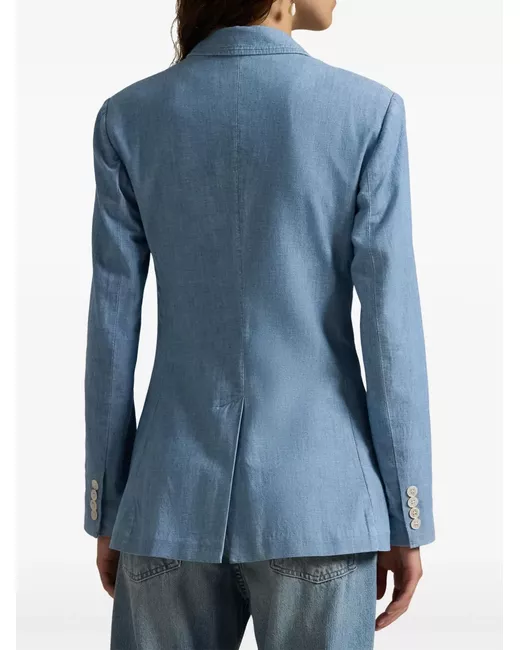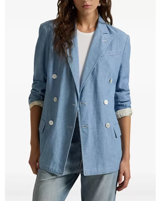 light blue double-breasted button fastening chest welt pocket two front flap pockets buttoned cuffs