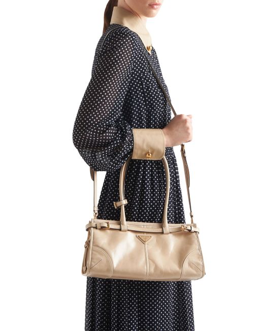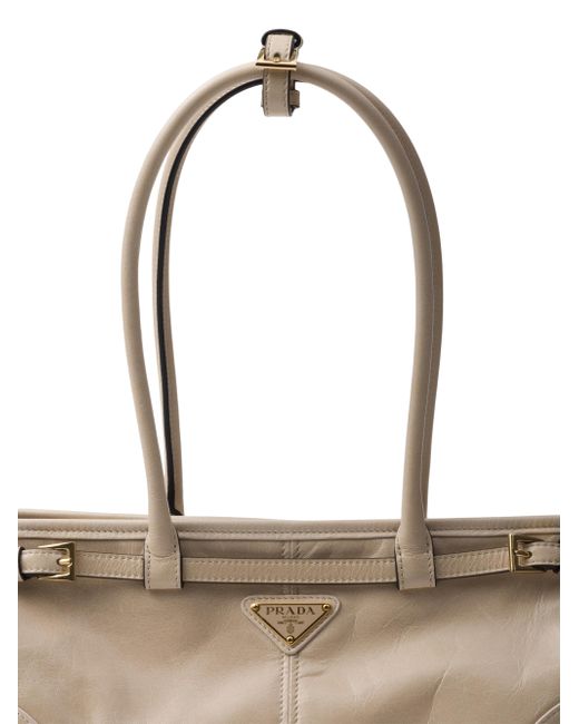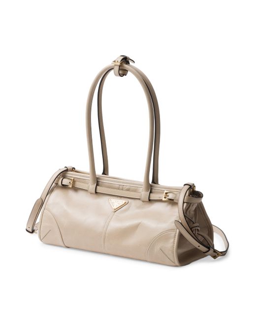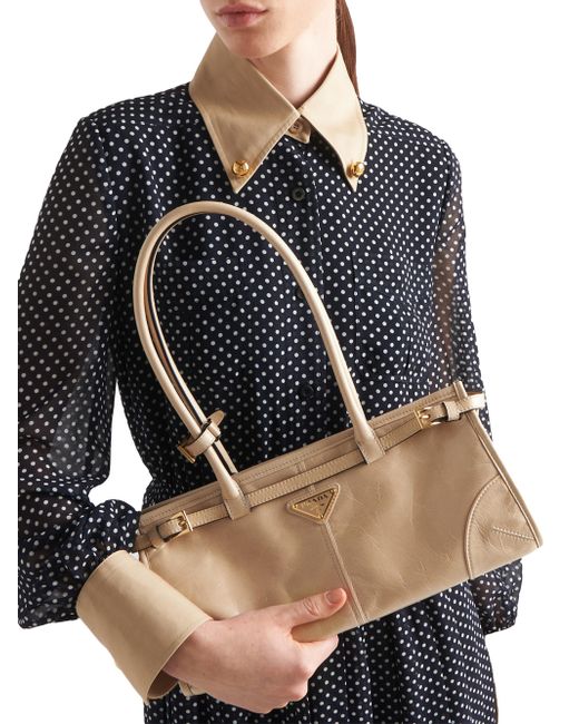 This pragmatic and refined handbag is made of soft leather with a glossy finish that emphasizes its versatile, modern allure. The geometric design blends different influences into one style with a distinctive but sleek aesthetic. Embellished by the sophisticated strap detail, the rectangular silhouette has zipper pockets inside. The enameled metal triangle logo completes the look with its iconic signature. Leather handles, 22 mm / 0.8'' drop detachable Adjustable shoulder strap Metal hardware Enameled metal triangle logo on the front Nappa and nylon interior with center zipper compartment and zipper patch pocket Made in Italy SIZE 12.5'' W x 6.1'' H x 4.7'' L. Lsd Handbags - Prada Handbags Access > Prada > Saks Fifth Avenue > Barneys. Prada. Color: Beige.
