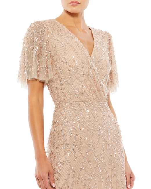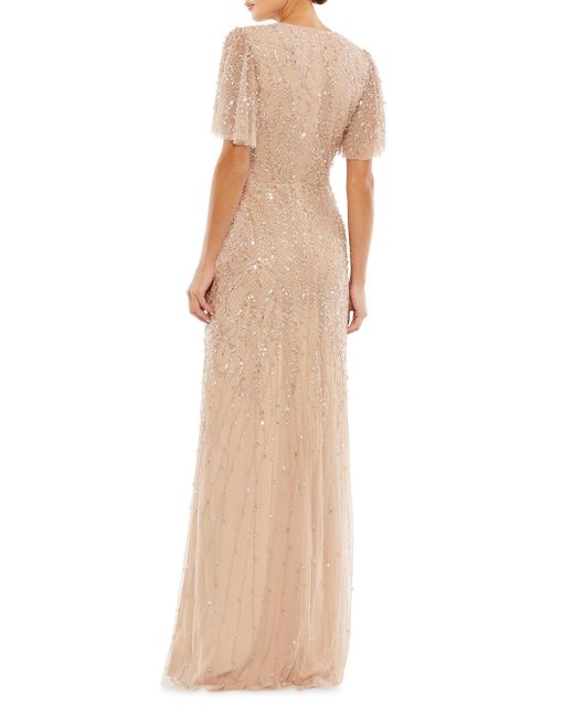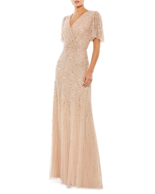 Metallic beading and sequins add shine to this feminine tulle gown. Surplice neckline Short flutter sleeves Concealed side zip Seamed waist Layered tulle skirt Pooled back hem Lined Polyester Dry clean Imported SIZE & FIT Column silhouette About 62.5" from shoulder to hem Model measurements: 5'10" tall Model is wearing a US size 4. Dress Collections - Mac Duggal > Mac Duggal > Saks Fifth Avenue > Barneys. Mac Duggal. Color: Beige. Size: 6.
