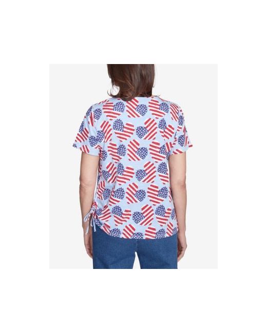 Show your love for the stars and stripes on this stylish top. Featuring short sleeves, and side tie ruching, this piece offers a playful and patriotic twist. The flag hearts add a touch of whimsy, making it the perfect addition to your summer wardrobe.