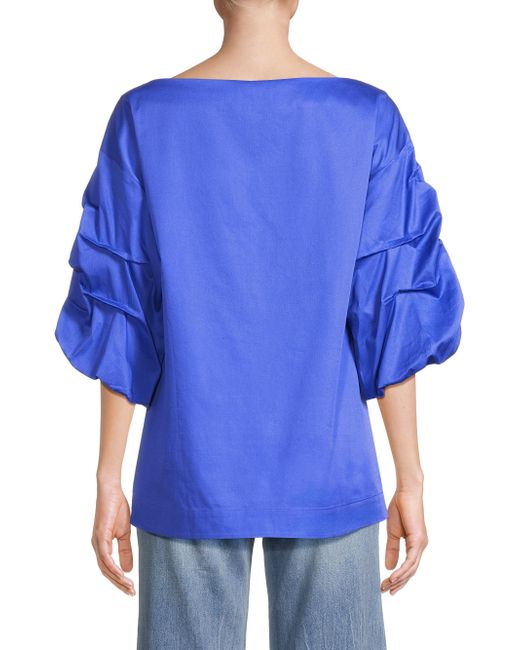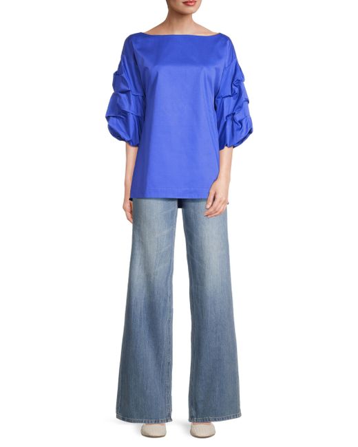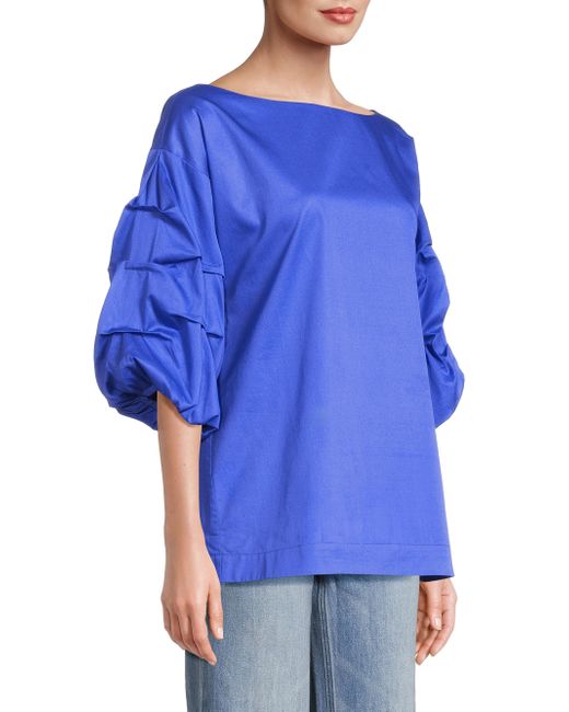 Made of cotton, this Balia blouse from Harshman is styled with a boatneck and tiered puff sleeves with delicate gathering. Boatneck Short puff sleeves Pulls over 100% cotton Machine wash Imported SIZE & FIT About 27" from shoulder to hem Model measurements: 5'10" tall Model is wearing a US size Small. Modern Collections - Branded Separates > Harshman > Saks Fifth Avenue > Barneys. Harshman. Color: Royal Blue. Size: XS.