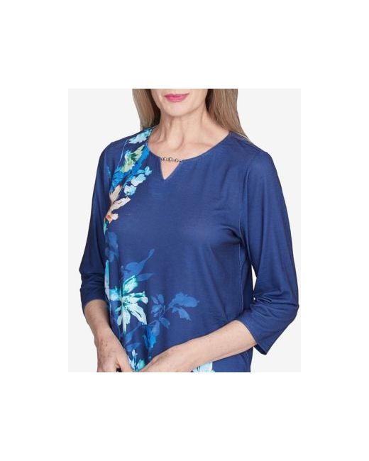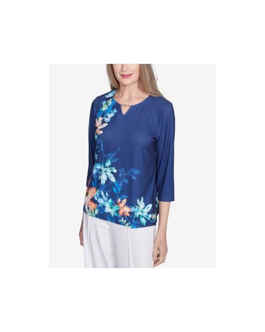 Women's Blue Nantucket Asymmetric Floral Beaded Split Neck Top