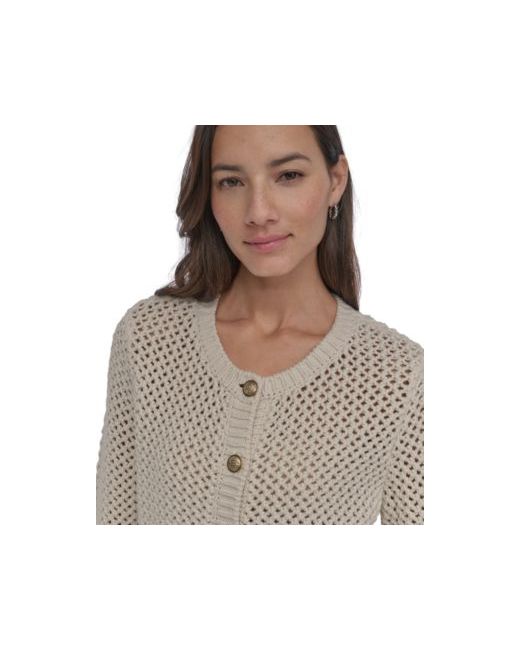 Dkny Jeans rethinks the cardigan, combining an open knit with tooled metal buttons for a stylish look.