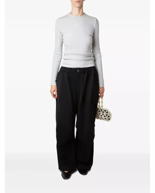 black front button and zip fastening elasticated waistband two side cargo pockets two rear flap pockets