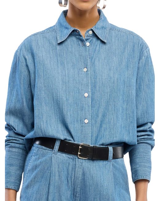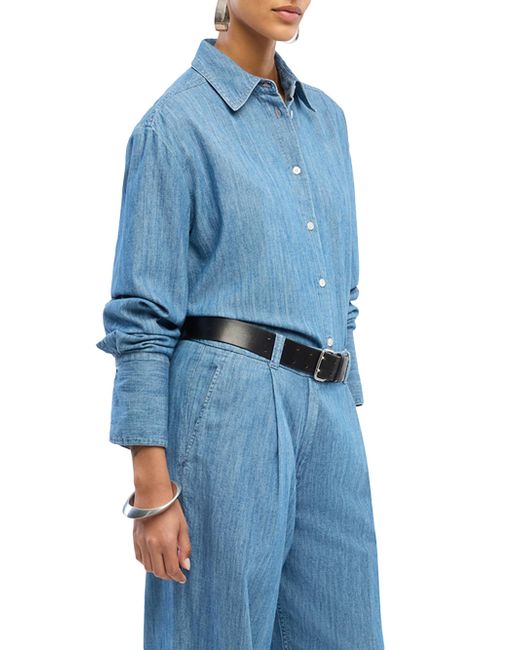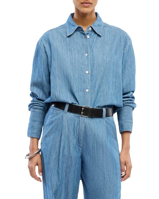 Crafted in a lightweight chambray, this shirt fits oversized. Featuring an exaggerated curve at the hem, back darts that create a cocoon shape, and an embroidered logo at the waist. Our denim is crafted in an Italian mill that has invested in circular systems since 1976. They utilize innovative technologies to use less energy and water than conventional denim while adhering to best-in-class chemical standards. 100% Cotton Made in Italy Long sleeve Recycled poly buttons Exaggerated curve at hem Darts at back Embroidered logo at waist Dry clean sparingly SIZE Runs true to size Oversized silhouette Model is 510'' and wears a size S. Lsd Rtw - Womens Rtw Lsd Mp > Another Tomorrow > Saks Fifth Avenue > Barneys. Another Tomorrow. Color: Medium Blue. Size: XS.