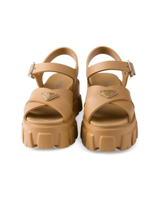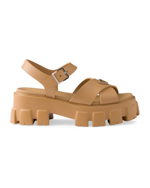 These rubber sandals with sporty touches and contemporary details are an emblem of Prada's unconventional and dual soul. The style characterized by the distinctive Monolith sole is completed by the iconic signature of the enameled metal triangle logo. Upper with metal buckle Enameled metal triangle logo Rubber sole: 55mm / 2.1'' Lug sole Imported. Lsd Rtw - Prada Rtw > Prada > Saks Fifth Avenue > Barneys. Prada. Color: Beige. Size: 5.