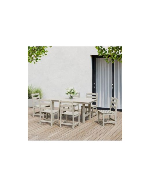 Create a warm and inviting outdoor dining area with our 7-piece Hdpe dining set that is the perfect dining set for 6. Made with a durable all-weather Hdpe material that is resilient against Uv rays and fading, making it the ideal material for the outdoors. Designed for comfort, sturdiness, and functionality from the contoured seats and arched backrest to the durable Hdpe-reinforced aluminum tabletop construction and the 1.9" built-in umbrella hole that is perfect for adding an umbrella and extra shade during those bright and sunny days.