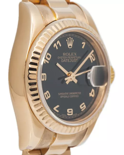 2003 pre-owned 26mm 18kt rose gold polished finish round face black dial Arabic dial stick hands signature Cyclops lens sapphire-crystal glass fluted bezel logo-embossed crown signature Oyster Perpetual bracelet folding clasp automatic movement This item comes with a standard one-year warranty from the boutique. Original box and papers included. Normal everyday use and external agents may reduce the lustre of gemstones and gold surfaces. To maintain, use specific, non-abrasive products specially meant for cleaning jewellery. Condition: EXCELLENT. This previously owned item is in near-perfect condition with no signs of damage or use.