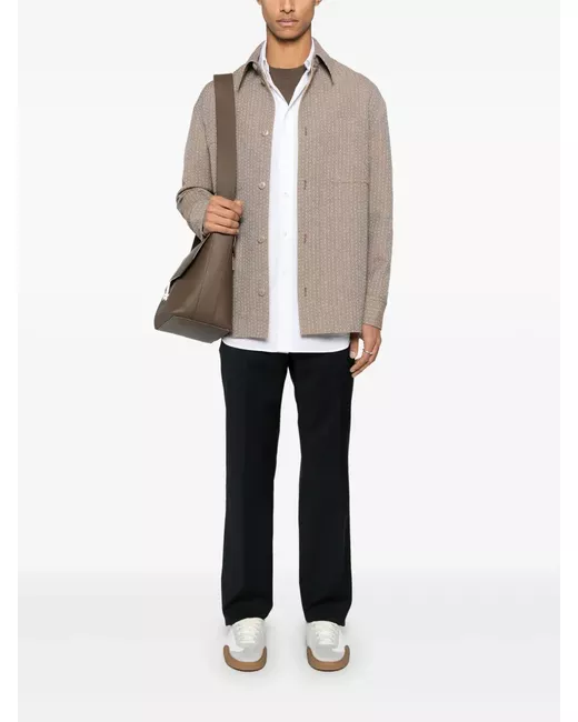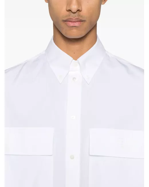 white front button fastening two chest flap pockets two side welt pockets buttoned-cuff sleeves