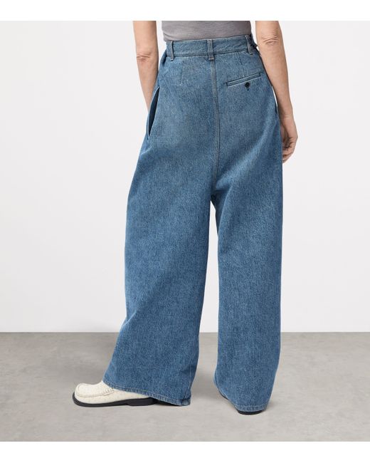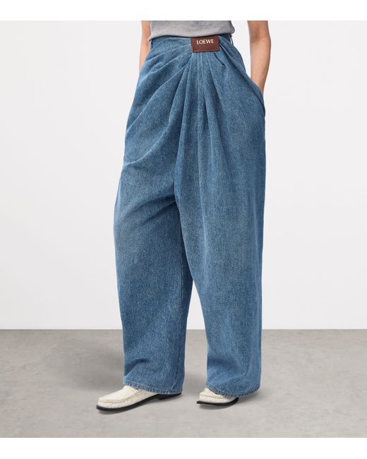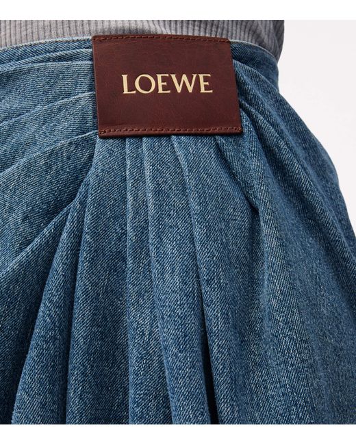 In loewe's Spring/Summer 2025, Jonathan Anderson's mastery of silhouette was evidenced in the curved, asymmetric flow of each look, with the structure of jeans, trousers and skirts enlivened with hand-gathered draping. Here, for example, it transforms its classic mid-wash denim fabric into the waist, with each fold pointing to the statement loewe leather patch.