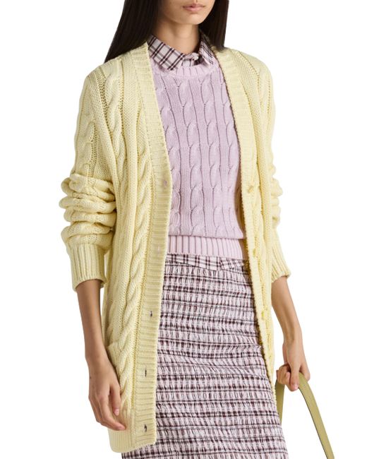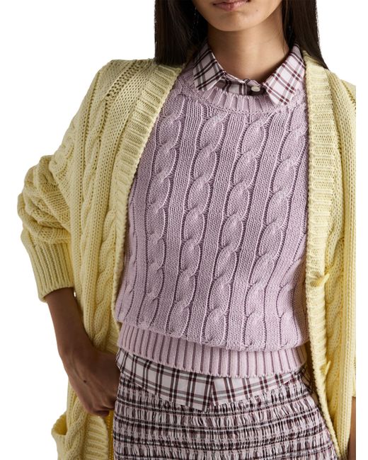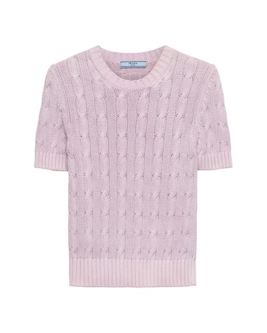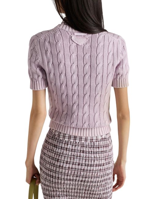 Short sleeves Cable-knit motif Boxy fit Ribbed knit crew neck Regular shoulder Ribbed knit sleeve trim and hem Knit triangle logo and logo label Imported 100% Cotton. Lsd Rtw - Prada Rtw > Prada > Saks Fifth Avenue > Barneys. Prada. Color: Purple. Size: 2.