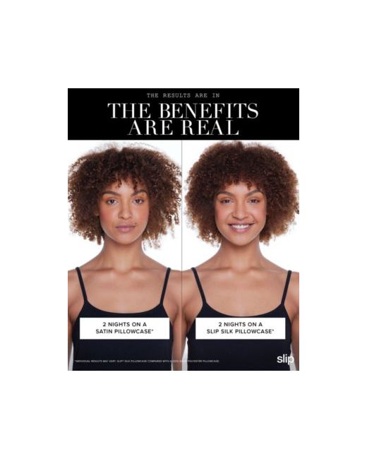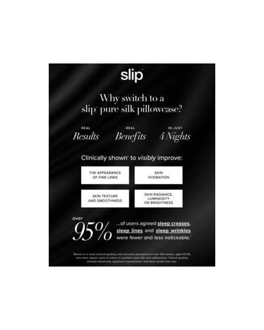 Slipsilk. Laboratory tested. Hypoallergenic. The beauty secret of celebrity hairstylists, dermatologists and beauty experts. Slip Pure Silk products are made using slipsilk, developed and refined for over ten years to provide the ultimate combination of shine, thickness, softness and durability. In laboratory testing, Slip Pure Silk Pillowcases were shown to absorb significantly less face cream than cotton pillowcases, so they can help keep your skin's moisture and valuable face and hair products where they belong, on your face and hair. Slipsilk was also shown to create 43% less friction on average,* which can reduce stretching and tugging on delicate facial skin, allowing skin to glide along the pillow, which can reduce pressure on creased skin. Slipsilk also helps avoid the hair tangling caused by ordinary cotton pillowcases. Why switch to a Slip Pure Silk Pillowcase? Real results, real benefits in just four nights!
