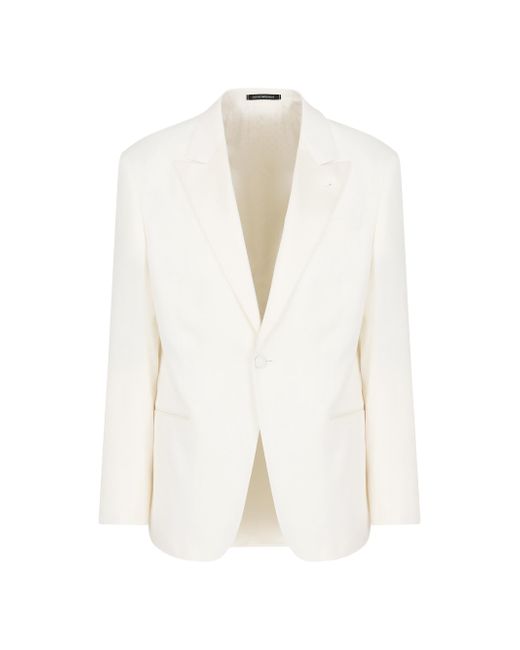 The Solid Bamboo dinner jacket from Emporio Armani highlights a monochrome design detailed with satin peak lapels, side welt pockets, and a single button closure. Peak lapels Long sleeves Chest welt pockets Side welt pockets Button-front closure 100% viscose Combo: 57% polyester/ 43% silk Lining: 100% viscose Dry clean Made in Italy SIZE & FIT Model measurements: 6'2" tall, 40" chest, 31" waist Model is wearing a US size 40R. Men Luxury Coll - Formal Wear > Emporio Armani > Saks Fifth Avenue > Barneys. Emporio Armani. Color: White Cream. Size: 48.