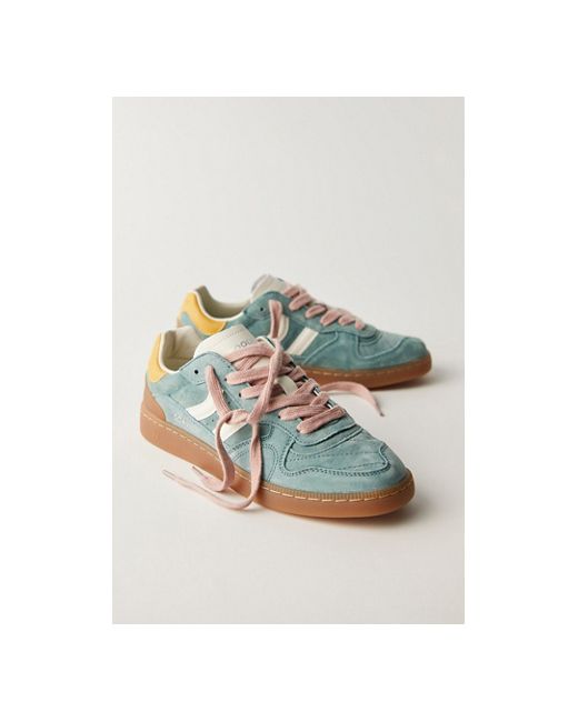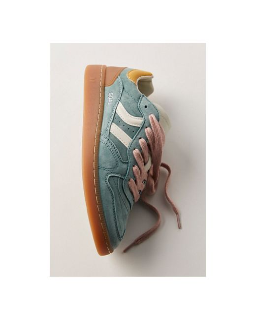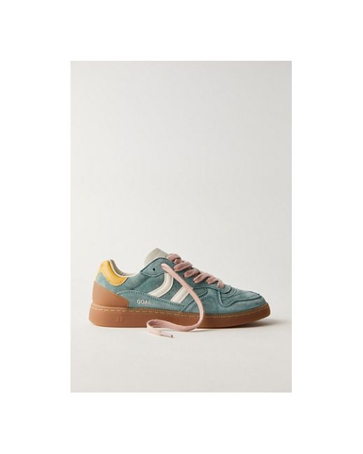 Step out in style with these fun colorblock sneakers featuring a split leather fabrication adorned with logo accents for a versatile pair you'll want to wear again and again. **Features:** Low-top style, suede uppers, leather accents, flat laces, stitched accents, slightly padded collar, flexible rubber soles **Why We ❤ It:** Designed in Spain, these sneakers feature shock absorption and high-quality materials. Coolway Goal Sneakers at Free People in Greyed Olive, Size: EU 38